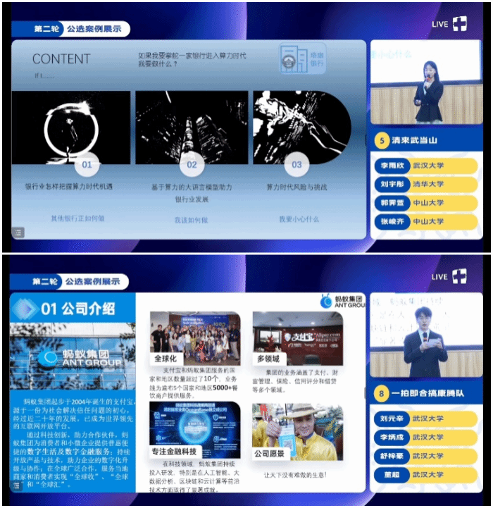 大赛自3月30日启动以来,共有来自清华大学、北京大学、中国人民大学、复旦大学、上海交通大学等140所高校的学生报名。初赛阶段,通过研讨“3.15 晚会”“娃哈哈”“AI 电商”“生命科学”四个话题,共收到418支队伍的精彩回答,其中50支参赛队伍进入复赛。4月20日至5月9日,大赛专家评审委员会综合自选案例分析文本撰写成绩及展示PPT成绩,最终9支队伍晋级决赛。