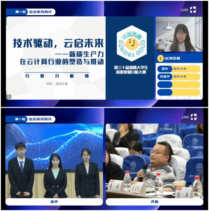 在第一轮自选案例展示中,9支代表队分别就“新能源汽车行业——智起未来”“技术驱动,云启未来——新质生产力在云计算的行业的塑造与推动”“物联网(IoT)行业全景——新时代技术革新与市场蓝图解析”等行业进行了专业分析,提出了对应预期计划与建议,各队伍的展示博得了观众与评委老师的好评。评委老师赞赏各队展示出的风采和团队能力,并对展示内容提出了专业而具有针对性的建议。