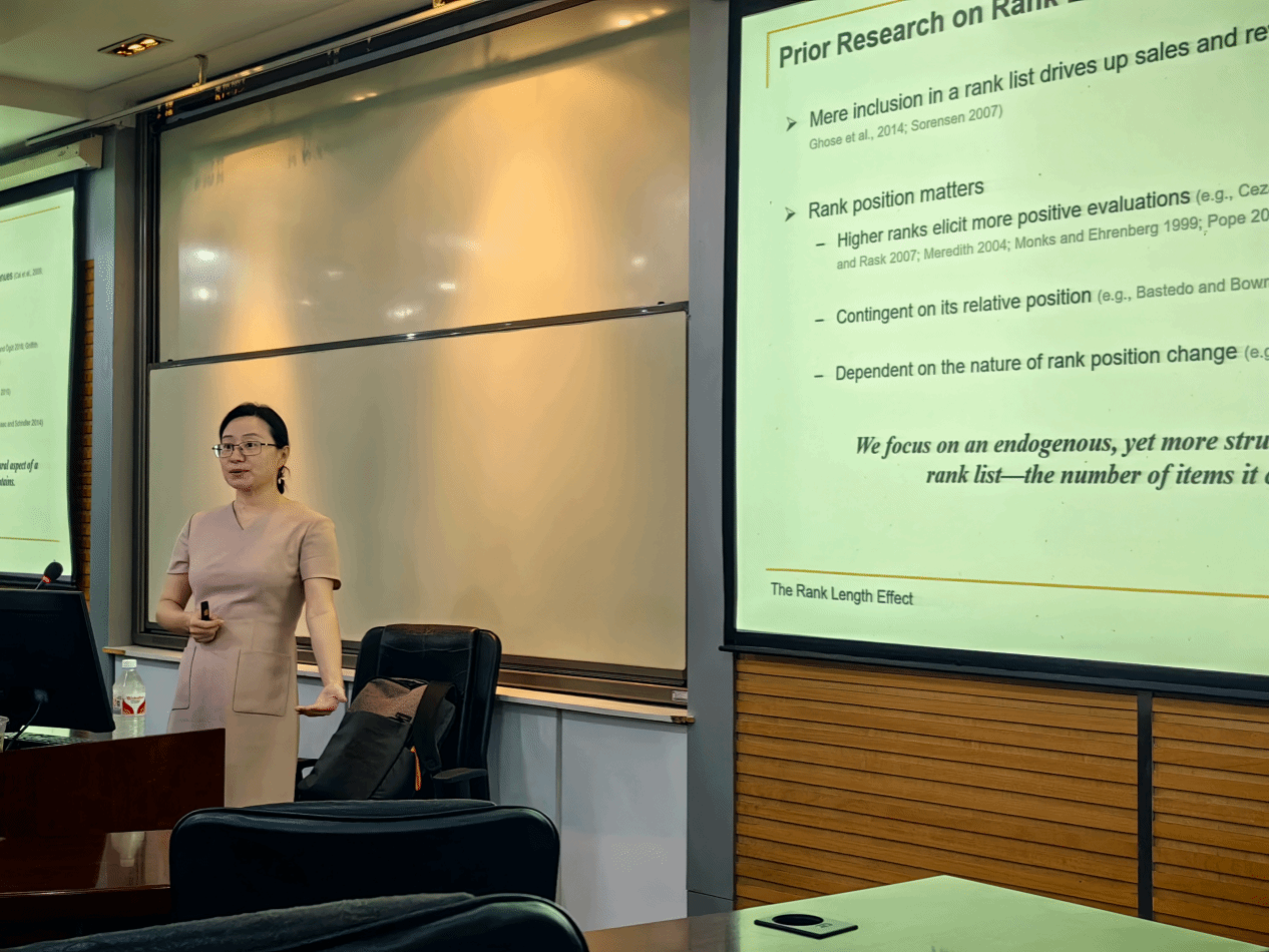 分享过程中,才教授与在场师生进行深入讨论和交流,探讨消费者在不同场景下对排名长度的反应、研究中田野实验的开展方式、具体研究过程以及投稿经验等问题。才教授的研究视角独特、实验方法严谨、逻辑思维清晰,为理论研究和实践应用带来重要启示。该项研究为企业如何更有效利用排名进行推广提供深刻洞见,与会师生收获颇丰。最后,朱华伟老师对此次学术论坛进行总结,对才教授精彩分享表示感谢。
