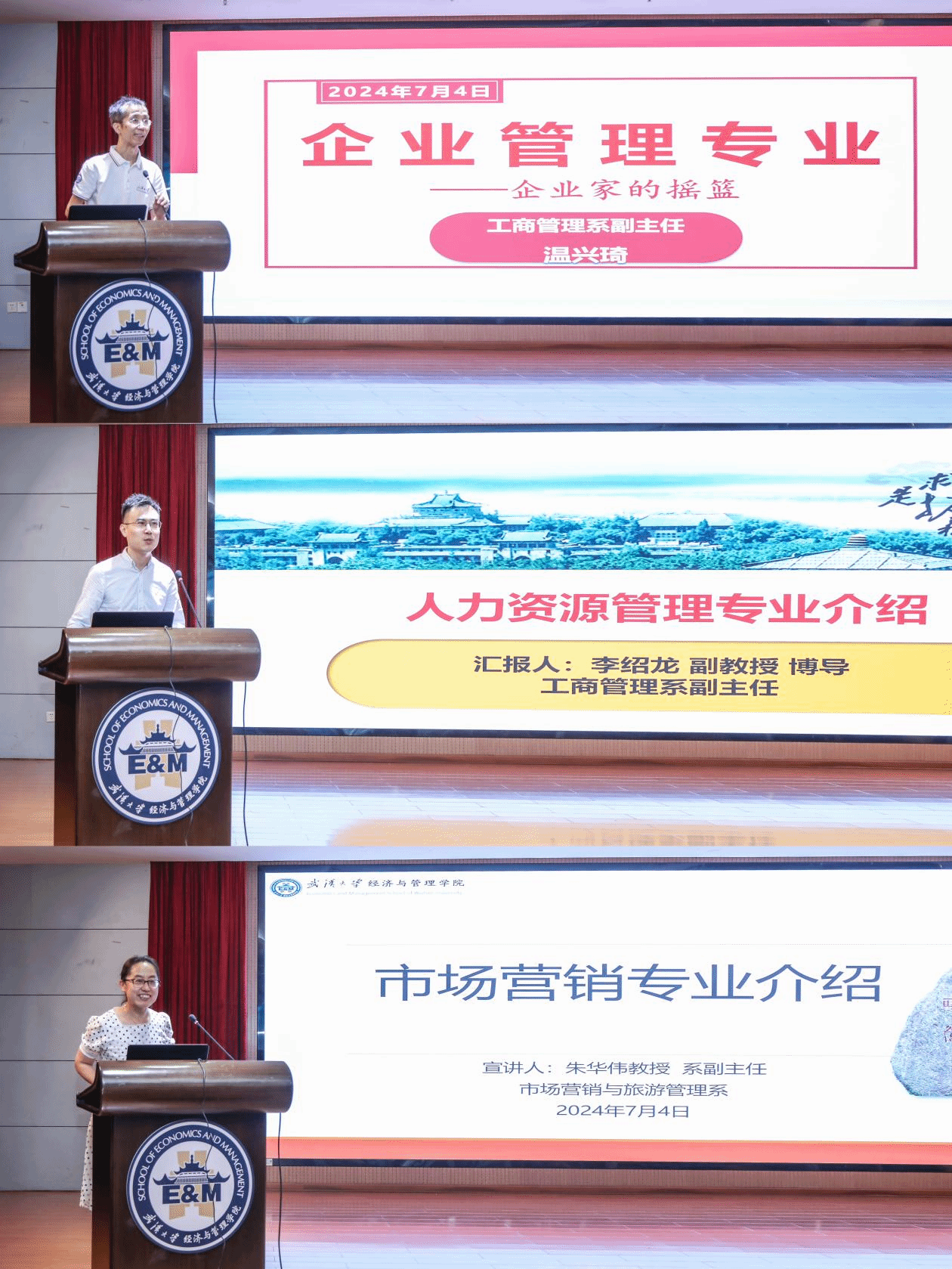 接着,温兴琦副教授向营员们介绍了企业管理专业,专业拥有深厚的学术底蕴,通过了国际精英商学院的三重认证,研究方向聚焦于中国企业的国际化与战略、创业创新与管理学研究。李绍龙副教授介绍了人力资源管理专业,诙谐幽默的语言获得了营员们的一致掌声。他在发言中表示,武大人力资源管理专业历史悠久,提供本硕博完整培养体系,并拥有强大的科研平台和基金支持。朱华伟教授介绍了市场营销专业。她表示,该专业在全国综合实力排名中位于第一阵营,自然科学基金立项数领先,且在本科及研究生就业、薪资方面表现出色。