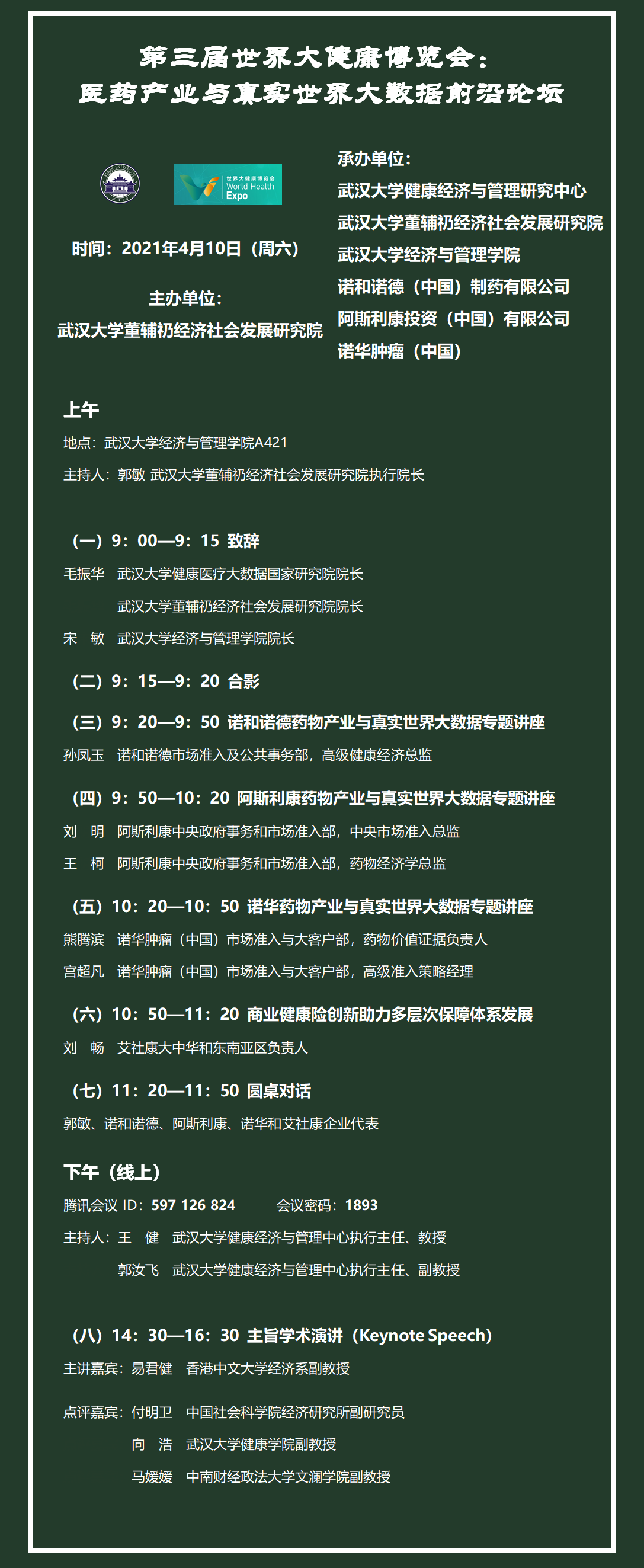本次会议是第三届世界大健康博览会的分论坛之一,主题为“医药产业与真实世界大数据前沿论坛”。会议由999策略白菜官方网站董辅礽经济社会发展研究院主办,999策略白菜官方网站健康经济与管理中心承办。一方面,由诺和诺德、诺华和阿斯利康等著名药企的药物经济学专家讲解药物产业政策。另一方面,由香港中文大学易君健副教授等健康经济学专家分享最新学术研究成果。此次会议将增强999策略白菜官方网站健康经济学的社会影响力。